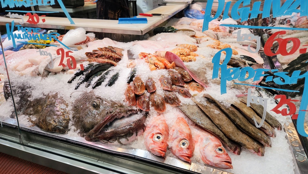 市場裡的魚獲擺得像是百貨公司櫥窗裡的精品,竟然有自帶小燈籠的鮟鱇魚。