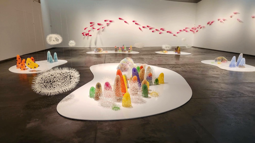 在此看到韓國藝術家創造的微觀世界,每個擬生物都是用尼龍束線帶編織而成。