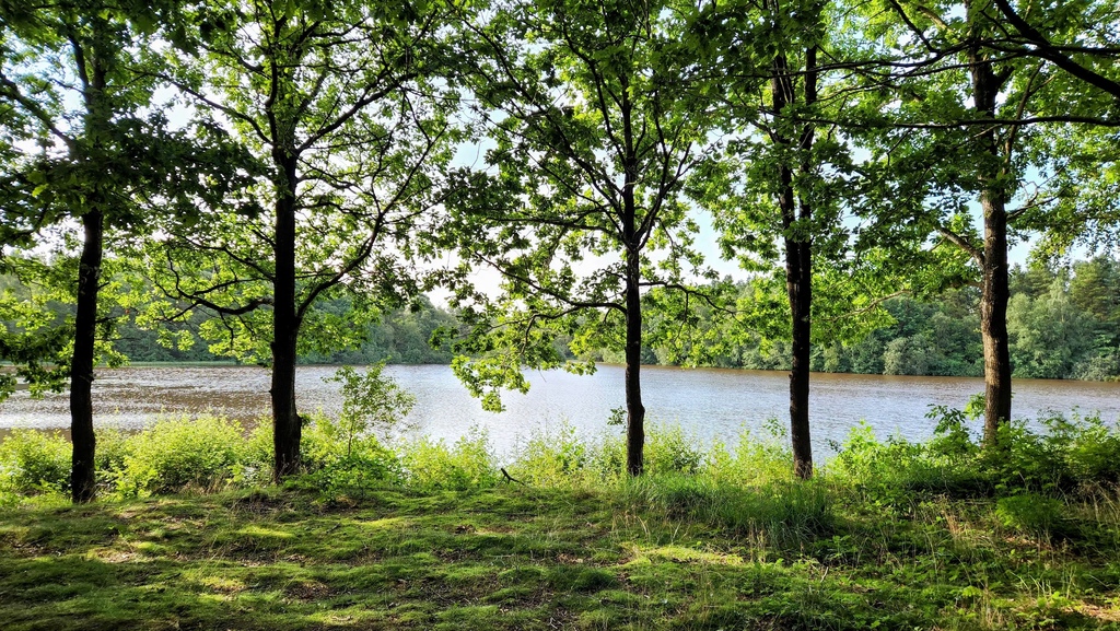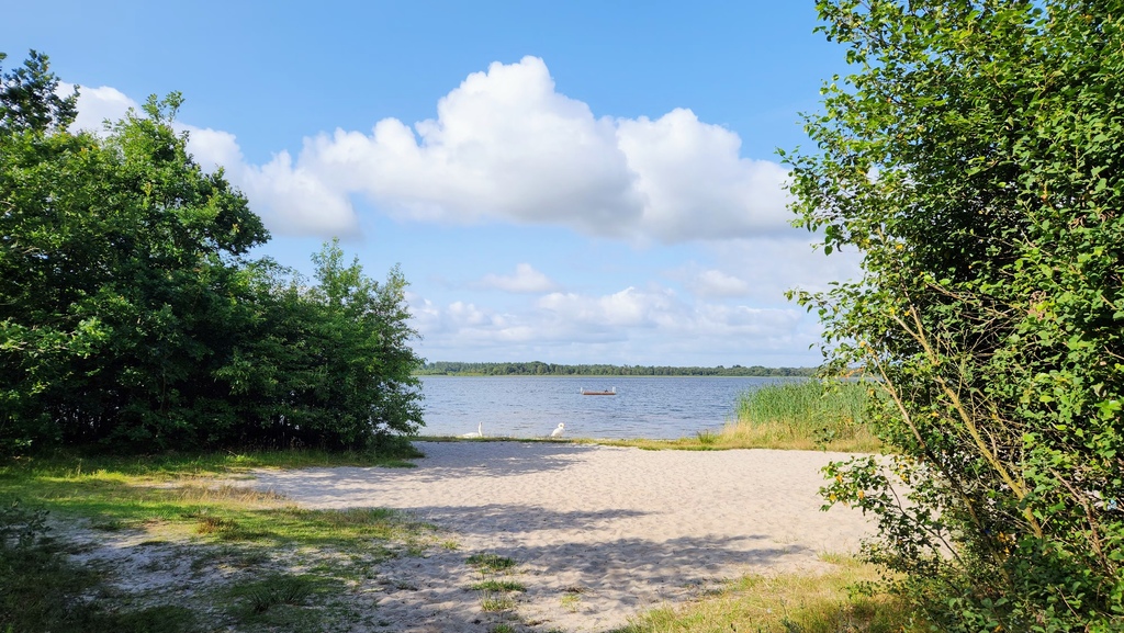 這是另一座清澈見底的游泳湖。非假日,天鵝爸媽和孩子們在岸邊、鴨子在浮臺上曬太陽。